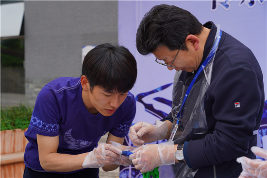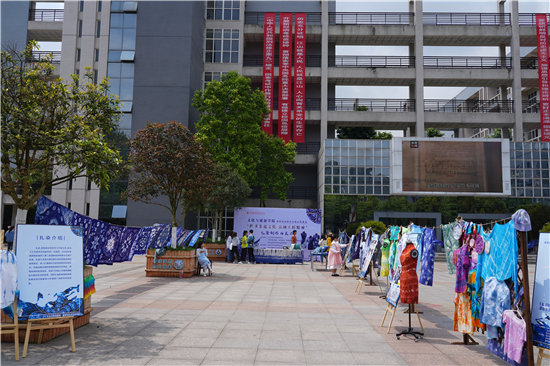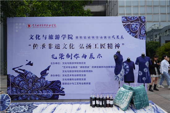 4月21日,重庆城市管理职业学院服装设计与工艺专业与学校劳动教育团队在学校教学楼广场举办“传承非遗文化 弘扬工匠精神”为主题的扎染制作与展示活动。