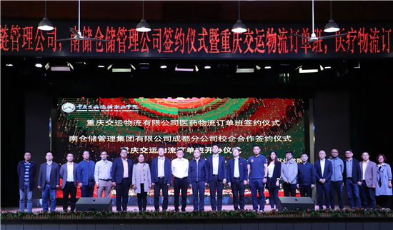 仪式上,重庆公共运输职业学院党委副书记李灿分别与重庆交运物流有限公司总经理熊智刚签订医药物流订单班协议,与南储仓储管理集团有限公司成都分公司总经理李永兴签订校企合作协议,并相互为学校作为企业人才培养基地,企业作为学校校外实习基地授牌,举行学校客座教授聘任仪式。