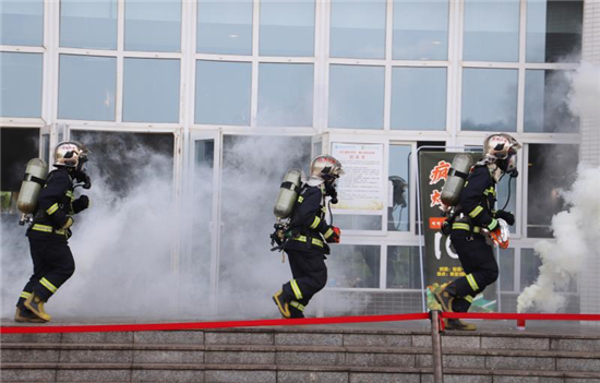 在火灾应急救援环节,模拟学术报告厅因突发火灾导致学生被困,学校安保人员联合江津区双福消防救援站工作人员,展开对被困学生的搜救和火场的扑灭工作。