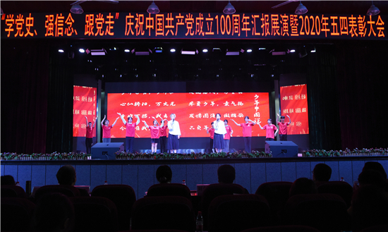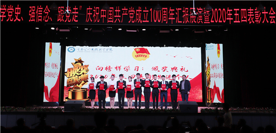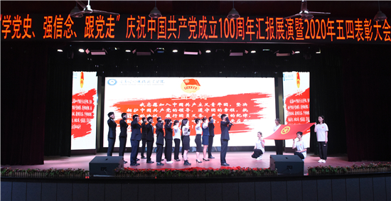 活动中,组织2020年上半年新入团团员登台进行入团宣誓。党委书记彭超、校长刘东燕等学校领导为在今年受到“五四”表彰的40个团学组织先进集体、685名青年团员先进个人代表颁奖。
