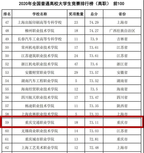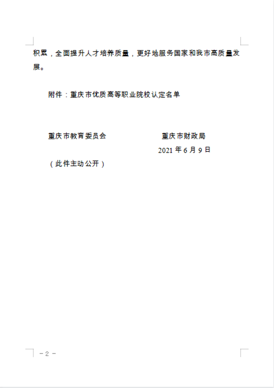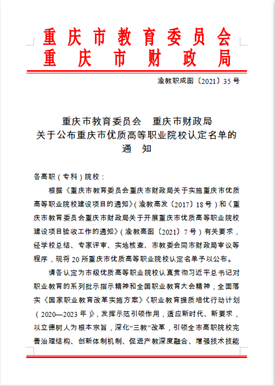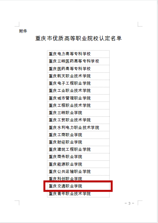 6月9日,重庆市教育委员会、重庆市财政局联合发文公布重庆市优质高等职业院校认定名单,重庆交通职业学院被认定为重庆市优质高等职业院校。