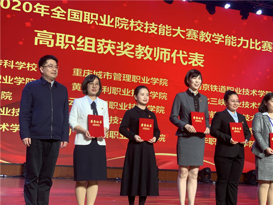 2020年全国职业院校技能大赛教学能力比赛作为教育部举办的唯一面向全国职业院校的教师教学赛事,在全国职业院校有着广泛的影响。今年比赛分为中等职业教育组、高等职业教育组和军事职业组。重庆城市管理职业学院作为高职组代表上台领奖。重庆城市管理职业学院被重庆市教委评为优秀组织单位。