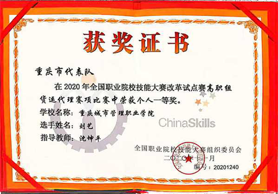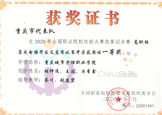 2020年11月全国职业院校技能大赛改革试点赛在山东举行,共同角逐19个赛。重庆共派出19个代表队参加高职组竞赛,其中重庆城市管理职业学院共派出货运代理、集成电路开发及应用两支代队,均获得一等奖重庆城市管理职业学院被重庆市教委评为优秀组织单位。