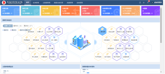 建成数据交换与共享平台、数据治理平台、智能大数据管理平台,实现全校数据的源头唯一,业务系统基础数据交换共享,消除“信息孤岛”。校本数据中心对校内业务系统各类型的结构化数据和非结构化数据进行数据治理和清洗,能为全校师生员工及各职能部门、各二级学院提供数据服务。
