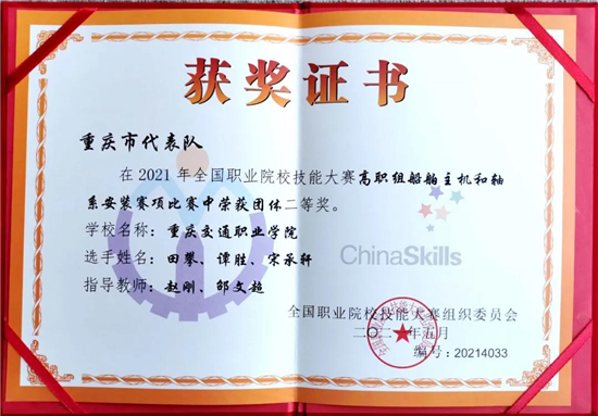 重庆交通职业学院荣获2021年全国职业院校技能大赛高职组“船舶主机和轴系安装”赛项二等奖