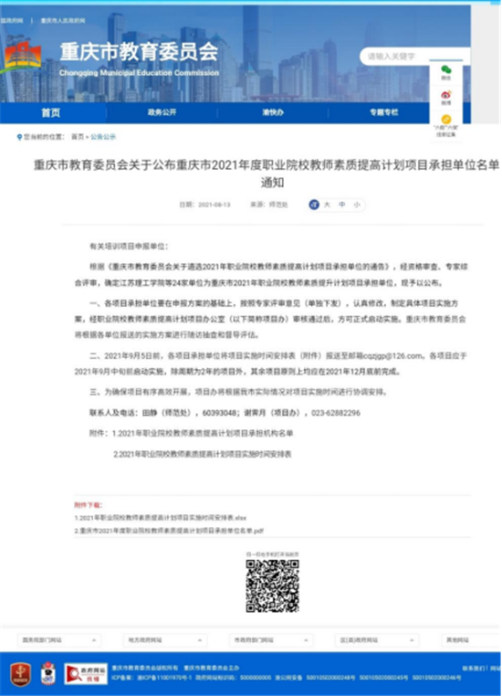 2021年7月,重庆市教育委员会启动了《2021年职业院校教师素质提高计划项目承担单位遴选工作》,学校临床医学院与学校附属第一医院(重庆市第六人民医院)积极申报,最终经资格审查、专家综合评审,重庆医药高等专科学校与重庆市第六人民医院联合申报的“医学与康养核心能力提升培训项目”成功获批,成为全市唯一的医药卫生类专业教师企业实践项目承担单位。