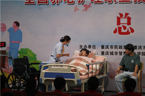 由重庆市民政局、重庆市人力资源和社会保障局、重庆市卫生健康委员会联合举办的全国养老护理职业技能大赛重庆市赛区选拔赛于9月15—18日在重庆城市管理职业学院举行。来自重庆各区县、市直属福利院的42支参赛队168名选手参加比赛。