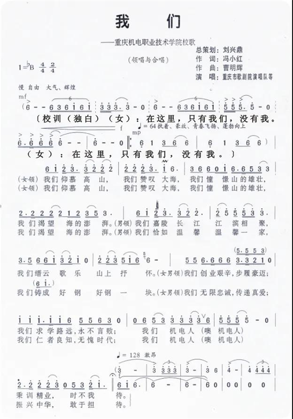 校歌《我们》结合学校的校训:“在这里,只有我们,没有我。”用校歌唱响这里的我们,唱出我们的精气神是我们的宗旨和期许。