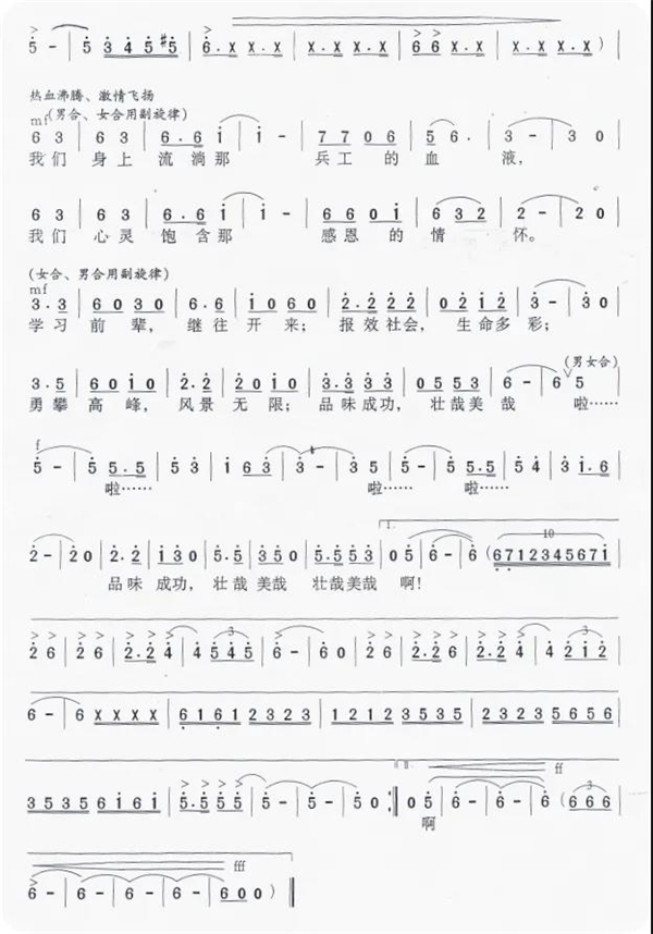 歌词结尾:学习前辈,继往开来;在报效社会中追求生命的多姿多彩;不畏高峰,勇于攀登,在那险峰欣赏无限的风景;品味成功,壮哉美哉。这就是我们机电人! 壮哉美哉!