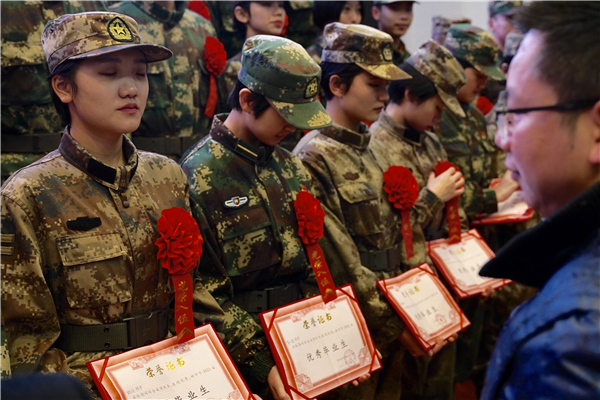 罗能副校长在仪式上宣读了优秀毕业生名单,由出席领导、老师向优秀毕业生颁发证书,分别向即将出征的士官生代表佩戴红花,并合影留念。