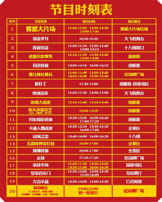 据了解,为能让游客们在春节期间能够真实的感受到中国传统民俗文化的魅力、体会属于中国民间的年味,春节期间两江影视城将为游客们在街区内轮番开展新春大巡游、川东婚俗表演、舞狮祈福、五路财神发红包等传统民俗表演,加之最新开放的二期项目《雾都大片场》、街头奇人杂耍、老重庆歌舞秀等节目,今年春节的两江影视城街区内总共将有近百个表演节目轮番呈现,在春节期间为游客来带来极致的观感享受。