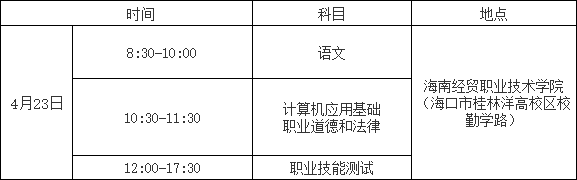 考试内容:海南省中职学校所开设的《语文》、《计算机应用基础》和《职业道德和法律》三门课程的基本知识。语文科目满分100分,考试时间为90分钟。两科选考科目采取合场、合卷的考试办法,两科卷面满分为100分,各占50分,考试时间共为90分钟。