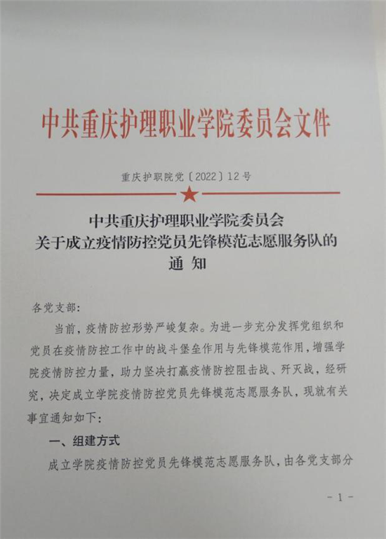 疫情就是命令。面对当前复杂严峻的疫情形势和艰巨繁重的防控任务,重庆护理职业学院迅速成立疫情防控党员先锋志愿服务队,充分发挥“主心骨”“领头雁”的示范引领作用,为打赢疫情防控阻击战凝聚起强大合力。