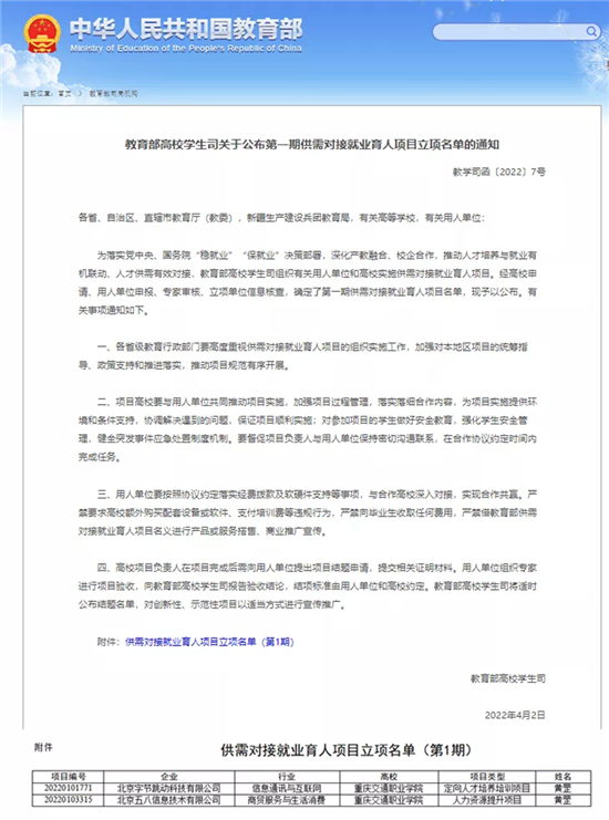 据悉,供需对接就业育人项目是教育部高校学生司为落实党中央、国务院“稳就业”“保就业”决策部署而开展的,以深化产教融合、校企合作,推动人才培养与就业有机联动、人才供需有效对接为目的的就业育人项目。