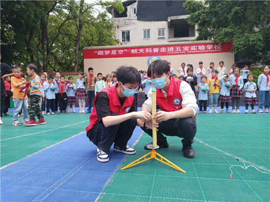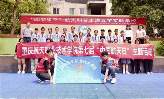为更好地扩大“中国航天日”的影响力,普及航天知识,弘扬航天精神,倡导科学理念,4月22日上午,在重庆江北区科协的大力支持下,重庆航天职业技术学院团委苑溢书记带领15名青年志愿者走进五宝实验学校开展了“圆梦星空”航天科普志愿服务。江北区科协副主席肖长琼、五宝镇党委副书记胡佐忠、五宝实验学校校长戚百川、五宝实验学校副校长胡登明出席了本次活动。