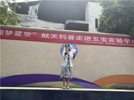 活动伊始,江北区科协肖主席为本次活动致辞。她指出,开展航天科普进校园活动是利用科普教育资源助推双减工作的有利举措,将先进的航天科技知识带给教育资源匮乏的村镇小学,可以助力乡村振兴,同时她还表达了对重职院师生的感谢。