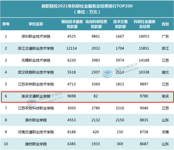 重庆交通职业学院2021年度科研及社会服务经费居全国高职院校前十