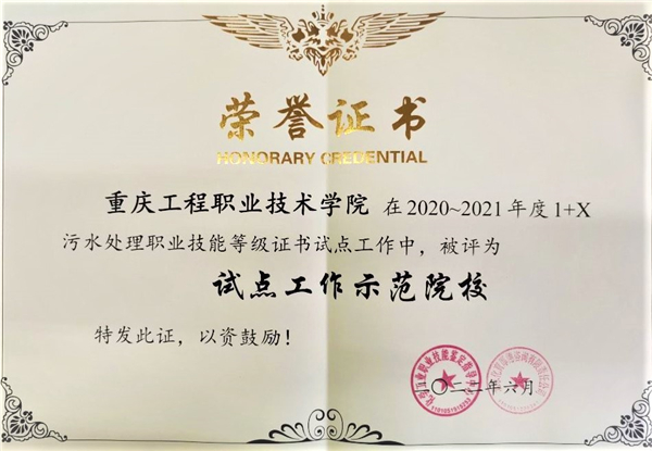 近日,教育部1+X污水处理职业技能等级证书评价组织召开了试点工作表彰会,对2020-2021年度1+X污水处理职业技能等级证书优秀单位和优秀个人予以表彰。在全国近200所院校评比中,重庆工程职业技术学院及其他20所院校被授予“试点工作示范院校”荣誉称号,重庆工程职业技术学院王金霞老师被授予“优秀教师”荣誉称号。