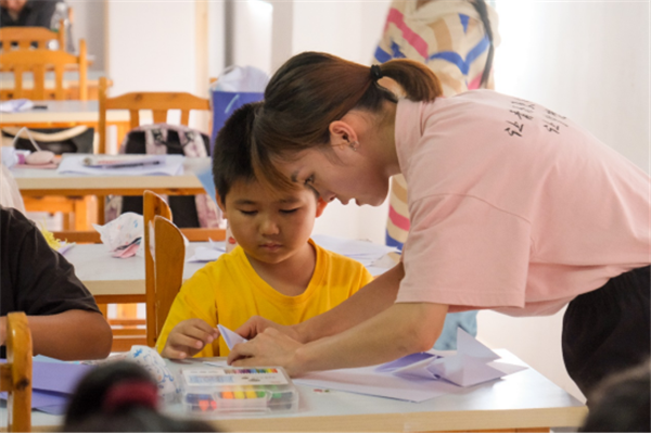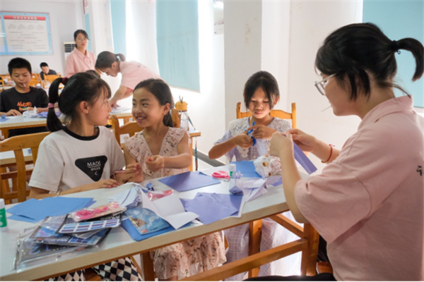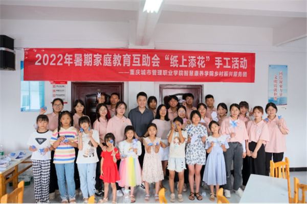 为促进7月7日,重庆城市管理职业学院智慧康养学院“三下乡”乡村振兴服务团走进丰都县双路镇楠木村,带领当地留守儿童开展家庭教育互助会“纸上添花”手工课堂。