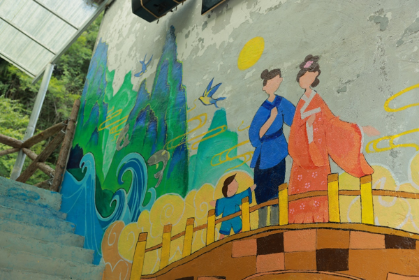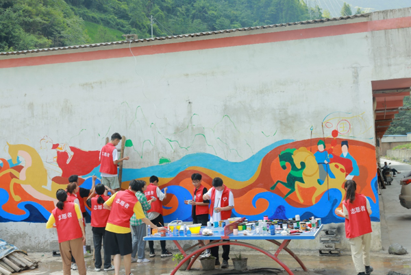 以墙为布,画美乡村。实践团通过墙绘美化乡村环境,为保证墙绘效果,实践团中的部分成员提前3天到达天子村。绘制前期,成员们为墙绘创作收集素材、积累灵感,一起交流讨论确定墙绘位置、尺幅,商讨墙绘设计方案,并根据天子村本地需求和特色,进行作品的创意构思。在确定方案后,志愿者们开始进行绘制,他们分工明确、配合默契,打底稿、勾线条、上颜色,每一个环节都做得细致入微。志愿者们一笔一画地在墙上绘制着天子村的名字由来和神话故事,空白的墙壁逐渐被色彩填满,美丽的画卷在墙上慢慢显现。正值大暑高温天气,队员们不畏烈日,潜心创作,经过6天不懈努力,完成了5幅墙绘作品,墙绘作品不仅改善了村容村貌,也提升了大家的专业能力。