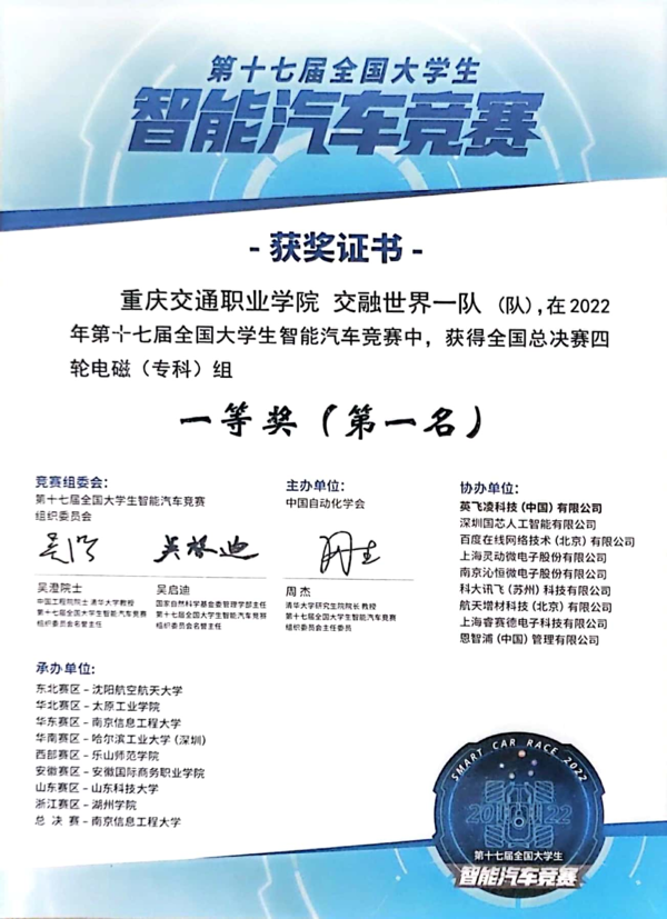 经过3天的激烈角逐,重庆交通职业学院卢江林老师、冉闯老师指导的交融世界一队(新能源300班文青、物联网245班周峰、汽试203班刘森)以第一名成绩荣获第十七届全国大学生智能汽车竞赛全国总决赛四轮电磁(专科)组一等奖,创下西部赛区高职院校首次获得该项目最高奖项。程鹏老师、熊如意老师指导的交融世界二队(物联网252班秦成程、机电209班徐浩然、汽试306班冉浪)以第十三名成绩荣获第十七届全国大学生智能汽车竞赛全国总决赛四轮电磁(本科)组二等奖。