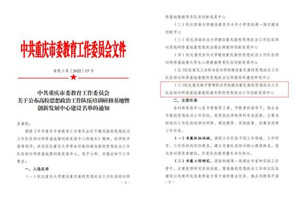 近日,中共重庆市委教育工委印发《关于公布高校思想政治工作队伍培训研修基地暨创新发展中心建设名单的通知》(渝教工委〔2022〕15号),重庆城市管理职业学院成功入选重庆高校思想政治工作队伍培训研修基地暨高职高专院校思想政治工作创新发展中心。