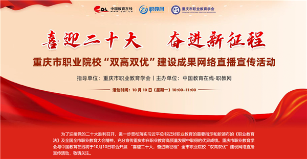 为了迎接党的二十大胜利召开,进一步贯彻落实习近平总书记对职业教育的重要指示和新颁布的《职业教育法》及全国全市职业教育大会精神,充分宣传重庆市在职业教育高质量发展中取得的优异成绩。必威体育登录网址 联合重庆市职业教育学会于10月10日共同举办“喜迎二十大,奋进新征程”全市职业院校“双高双优”建设网络直播宣传活动。