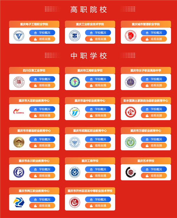 届时,重庆17所职业院校讲师将走进直播间全面介绍学校的办学模式和育人方式,分享产教融合、校企合作经验,期待您的关注!