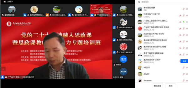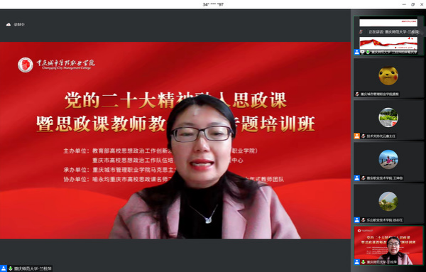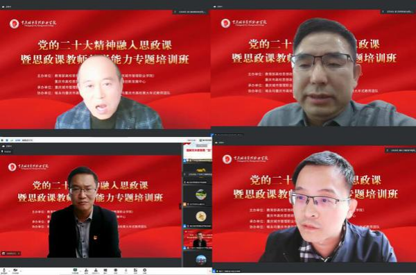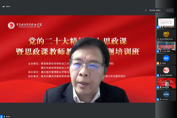 为深入学习贯彻落实党的二十大精神,有效推动党的二十大精神融入思政课,切实提升高职院校思政课教师教学能力,11月26日,由教育部高校思想政治工作创新发展中心(重庆城市管理职业学院)、重庆市思想政治工作队伍培训研修基地暨创新发展中心主办,重庆城市管理职业学院马克思主义学院承办,喻永均重庆市高校思政课名师工作室、喻永均重庆市高校黄大年式教师团队协办的“党的二十大精神融入思政课暨思政课教师教学能力”专题培训班成功举办。全国40余所高职院校分管校领导、马克思主义学院院长、思政部主任和骨干教师510余人通过线上线下方式参加。
