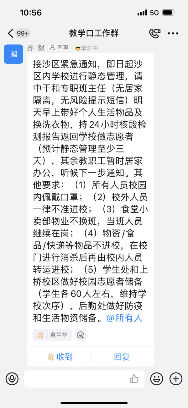 疫情发生以来,学校第一时间召开新冠肺炎疫情防控工作部署会。一方面,科学精准强化学校疫情防控措施。修订《校园突发新冠肺炎疫情应急处置实操手册》,完善组织机构、应急处置流程、应急准备和处置措施,并第一时间通过官网官微、线上科务会、班主任会、教学工作会等方式将新版疫情防控指南宣传培训到位,将学校疫情防控工作会议精神传达到位。此外,通过在张家湾校区和上桥校区开展内部疫情防控应急演练,强化“未雨绸缪思良策”的应急处置能力。另一方面,每日“校园疫情防控工作调度会”常态化常规化进行,对校园疫情防控各项举措的落实情况进行研判和完善,对线上教育教学情况、校内物资供应保障、校内外师生管理工作、党员干部下沉社区志愿服务情况等进行汇总,坚决不漏一人,不掉一事,汇聚起最广泛、最强大的疫情防控力量。