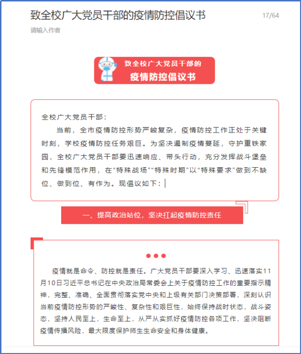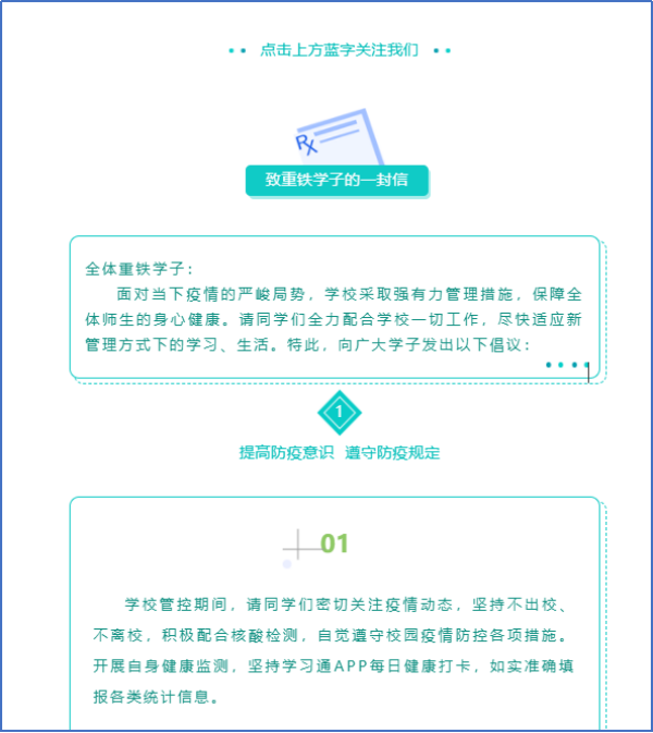 学校充分利用各类媒体平台,校园广播站,及时传达宣传疫情防控政策和学校疫情防控工作要求,对全校师生加强科普教育和思想引导,做好疫情防控舆情引导,营造良好的校园文化生活氛围。并先后发出《致全校广大党员干部的疫情防控倡议书》、《致重铁学子的一封信》,进一步强化疫情防控责任感、使命感和紧迫感,共同打赢这场疫情防控歼灭战。