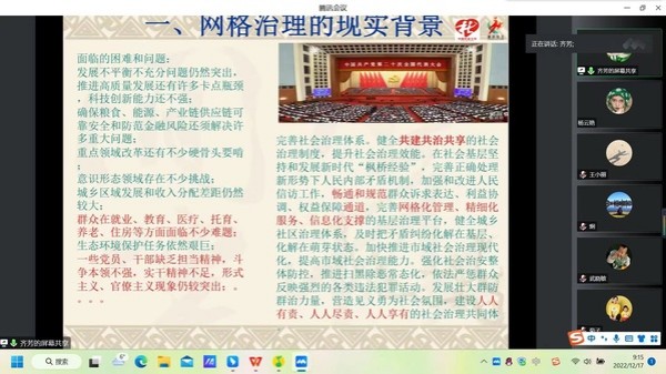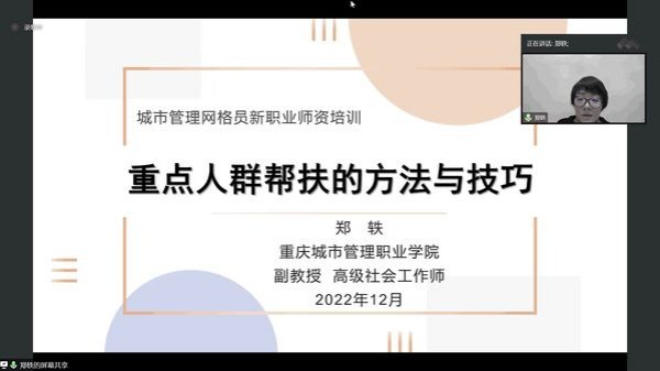12月17日,由重庆市职业技能公共实训中心主办,重庆城市管理职业学院承办的重庆市首期城市管理网格员新职业师资培训班顺利举行。来自重庆城市管理职业学院相关专业教师及社会从业人员共计40余人参加了本次培训,培训以线上方式进行。