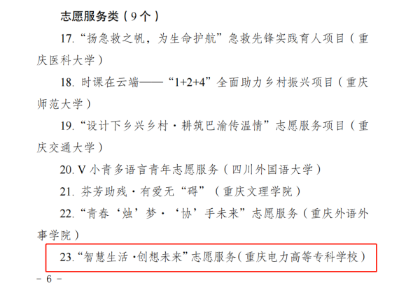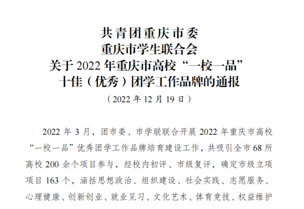12月19日共青团重庆市委员会、重庆市学生联合会下发《关于2022年重庆市高校“一校一品”十佳(优秀)团学工作品牌的通报》,重庆电力高等专科学校信息工程学院申报的“智慧生活·创想未来”志愿服务项目获评2022年重庆市高校“优秀团学工作品牌”。