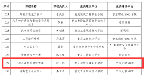 近日,教育部发布《关于2022年职业教育国家在线精品课程遴选结果的公示》,确定2022年职业教育国家在线精品课程,重庆城市管理职业学院文化与旅游学院殷开明老师主持的《酒水调制与酒吧管理》课程成功入选。