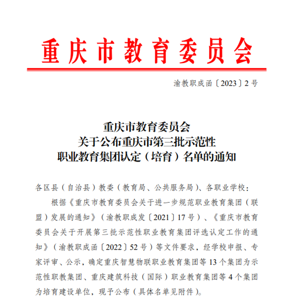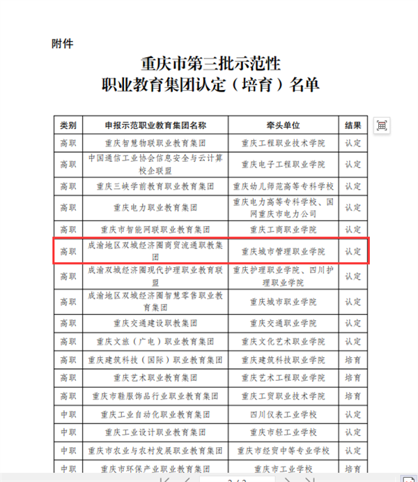 近日,重庆市教育委员会公布了重庆市第三批示范性职业教育集团认定(培育)名单,重庆城市管理职业学院牵头组建的“成渝地区双城经济圈商贸流通职教集团”被成功认定为“重庆市第三批示范性职业教育集团”。