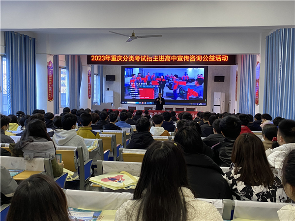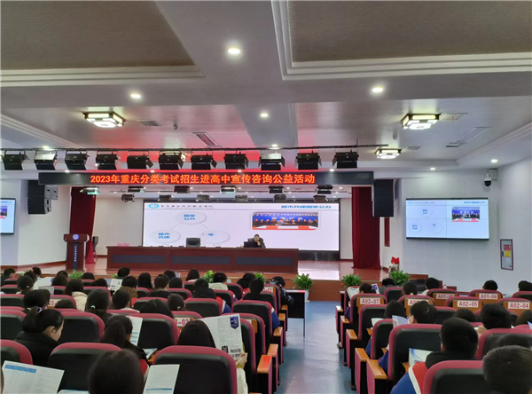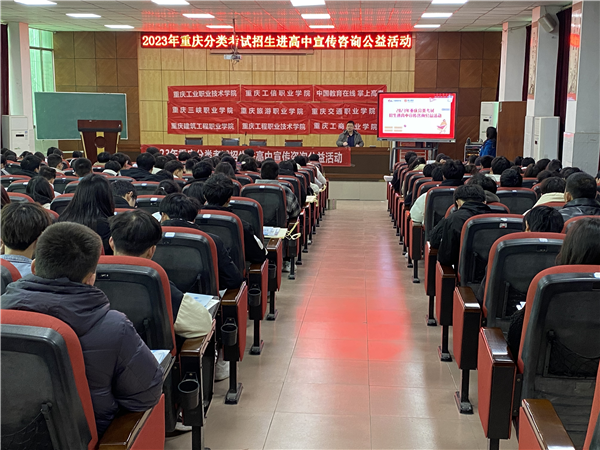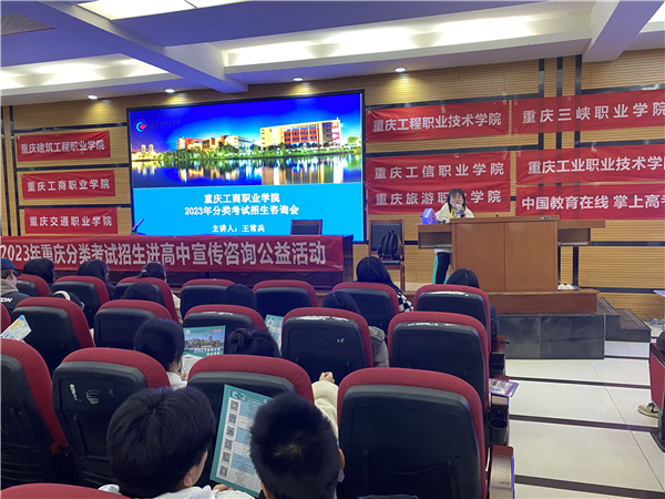 此次宣讲活动邀请到了重庆工业职业技术学院、重庆电力高等专科学校、重庆工程职业技术学院、重庆工商职业学院、重庆三峡职业学院、重庆旅游职业学院、重庆安全技术职业学院、重庆建筑工程职业学院、重庆工信职业学院、重庆交通职业学院的老师以讲座的形式,走进高中,为即将参加分类考试的学生作分类资讯宣讲。