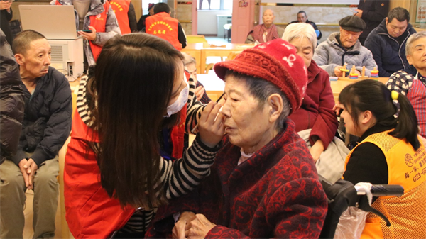 学校人物形象设计专业学生组成的志愿者服务团队为香炉山街道养老服务中心平均年龄70岁以上的老人梳妆打扮、拍照留影。在一片欢声笑语中,志愿者们将一张张洋溢着幸福笑脸的照片送到每位爷爷奶奶手中,老人们接过照片,流露出幸福的笑容。