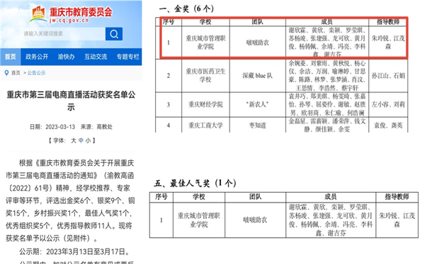 近日,重庆市第三届电商直播活动比赛结果揭晓。重庆城市管理职业学院大数据与信息产业学院“啵啵助农”团队荣获重庆市第三届电商直播活动比赛金奖,并获得本次比赛“最佳人气奖”。
