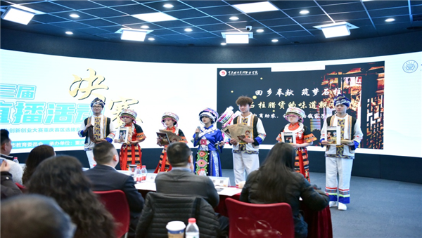 本次比赛由市教委主办,旨在深入实施创新驱动发展战略,加快推进“大众创业、万众创新”,积极引导和支持各参赛团队围绕乡村振兴进行选品带货,切实推动“电商直播助农”打通乡村振兴发展“最后一公里”,大力培养直播电商高素质技术技能人才。比赛选拔赛阶段采用线上方式进行,重庆城市管理职业学院大数据与信息产业学院数字媒体专业谢欣霖、黄欣、栾颖等13名同学组成“啵啵助农”团队积极备赛,在专业教师的悉心指导下,整个队伍配合紧密,合理分工,统筹推进,积极深入到石柱县开展电商直播备赛工作,成功入围重庆市第三届电商直播活动总决赛。在总决赛阶段,师生团队根据专家意见积极优化,不断打磨、反复迭代、坚持练习,最终以全场最高分脱颖而出获得金奖。下一步,团队将结合当下直播电商发展趋势,强化对短视频运营能力的培养,覆盖直播策划、直播销售、直播运营、直播推广四个核心岗位,助力提升直播电商人才培养质量,积极谋划和推进电商直播创新创业落地。