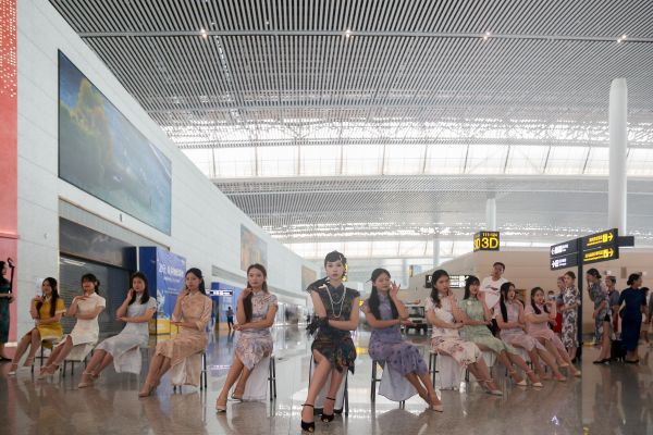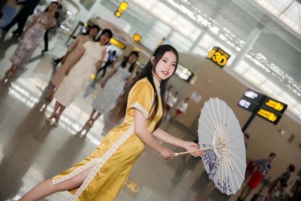 突然一曲清澈悠扬的琵琶旋律响起,正当大家还在寻找乐曲声源时,只见12名身着旗袍的女子缓缓入场,映入旅客眼前。