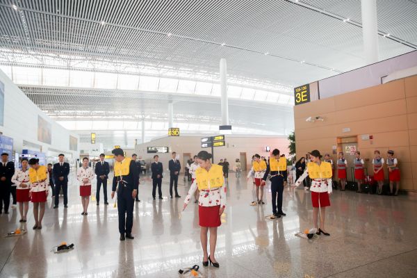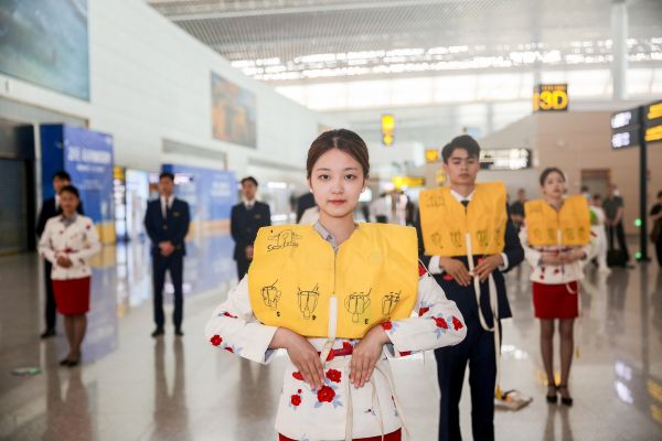 救生衣、氧气面罩的使用演示,安全须知提示说明……同学们用专业的演绎告诉大家:每一位空中乘务员都是经历了日复一日的严格训练,只为保障旅客的生命安全。
