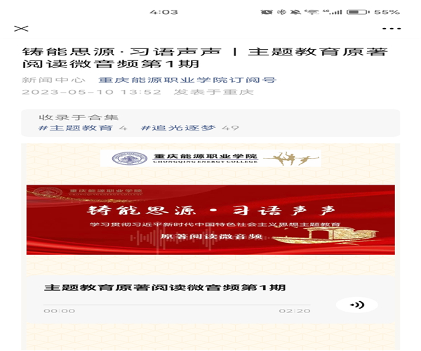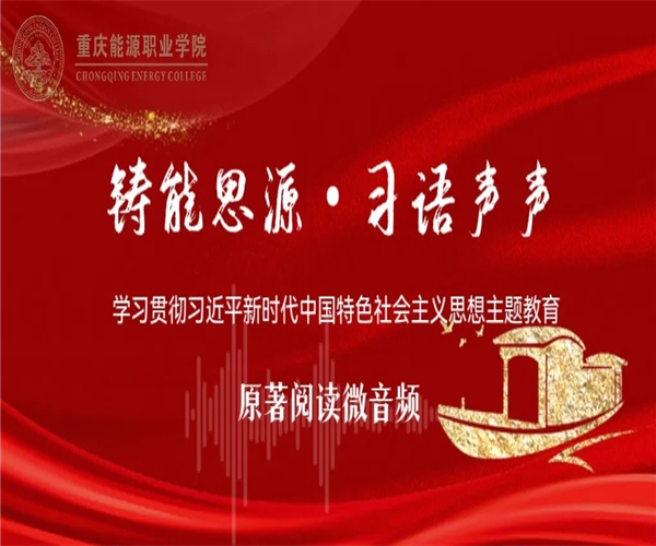 “铸能思源·习语声声”学习贯彻习近平新时代中国特色社会主义思想主题教育原著阅读微音频第1期在重庆能源职业学院官方微信平台火热上线。第1期微音频选择的内容为《习近平著作选读》第一卷《高举中国特色社会主义伟大旗帜 为全面建设社会主义现代化国家而团结奋斗》选段,由党员学习教育服务中心讲解员、星火研习社社员播读并讲述学习原著的心得体会。微音频上线后,师生竞相倾听、转发,有效引导师生主动读原著、学原文、悟原理、深思考。