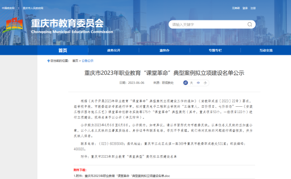 6月6日重庆市教育委员会公示了2023年职业教育“课堂革命”典型案例立项建设名单,学校《基于提质培优增值赋能,创新“人字梯形”教学模式,实施课堂革命——《汽车机械结构与拆装》课程教学改革与实践》公示立项。