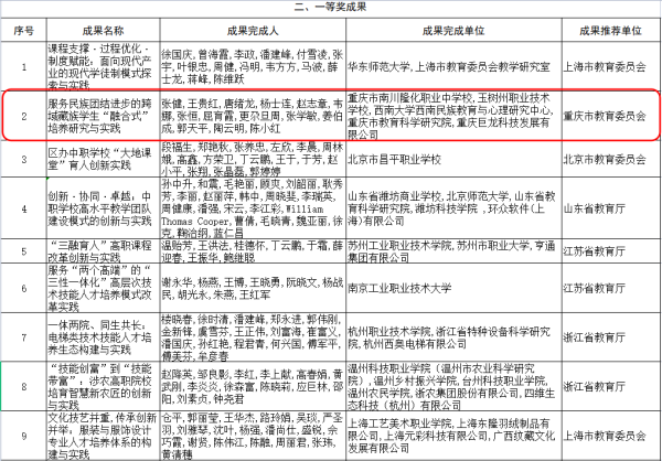 2023年5月15日教育部对2022年职业教育国家级教学成果奖拟授奖成果进行了公示:重庆开州区巨龙中等职业技术学校参与的《服务民族团结进步的跨域藏族学生“融合式” 培养研究与实践》荣获国家级教学成果一等奖。