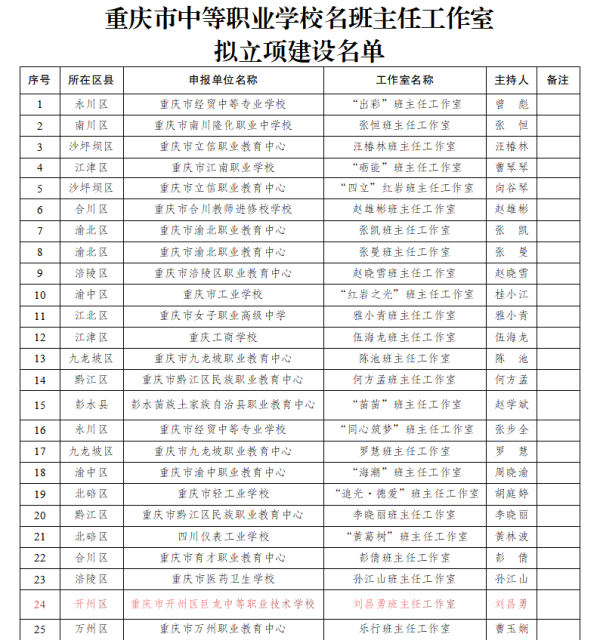 6月6日重庆市教育委员会公示了2023年中等职业学校名班主任工作室拟立项建设名单,学校刘昌勇名班主任工作室获得立项。