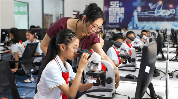 为了给小学生们绝佳的职业体验,重庆智能工程职业学院安排骨干教师、高级工程师和优秀大学生志愿者为参与体验的小学生展示、讲解和实操,从5G机器人对话到编程、从工业机器人绘图到显微镜观察,营造真实浓郁的职业场景,以达到沉浸式体验的最佳效果。