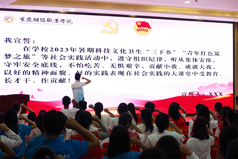 7月3日上午,重庆财经职业学院举行了2023年暑期“三下乡”社会实践暨“青年红色筑梦之旅”活动出征仪式。学校领导,二级学院党总支书记、团总支书记,各实践团队成员,学生代表近200人参加了活动。