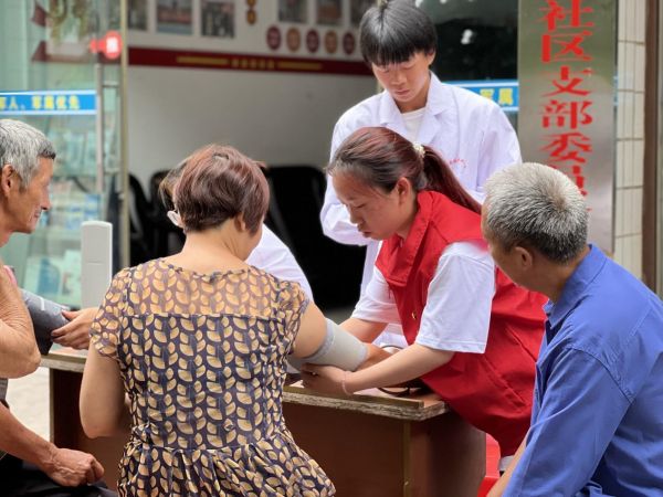 卫生健康服务队成员在合川区龙市镇为当地百姓测量血压
