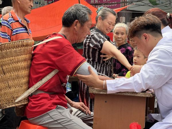 团队成员在龙市镇菜市口摆点,为当地百姓爱心义诊、艾灸、推拿按摩、健康知识宣讲