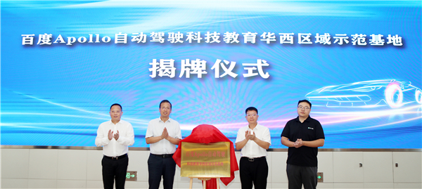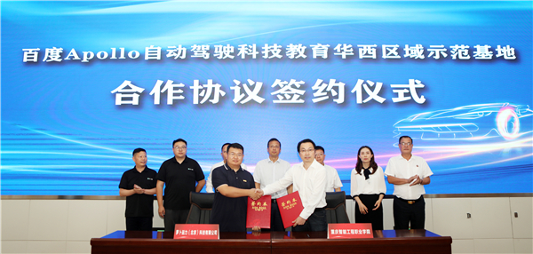 8月22日,百度Apollo携手重庆智能工程职业学院共建“百度Apollo自动驾驶科技教育华西区域示范基地”揭牌仪式在永川举行,标志着高校首个百度自动驾驶汽车机器人智控封闭测试训练场正式投用。市教委副主任杨卫军、永川区人大常委会副主任张正元、永百度自动驾驶商业运营部总经理毕然、百度自动驾驶测试保障部总经理王海军、重庆智能工程职业学院校长程前等出席并共同见证“百度Apollo自动驾驶科技教育华西区域示范基地”合作协议签约和揭牌。